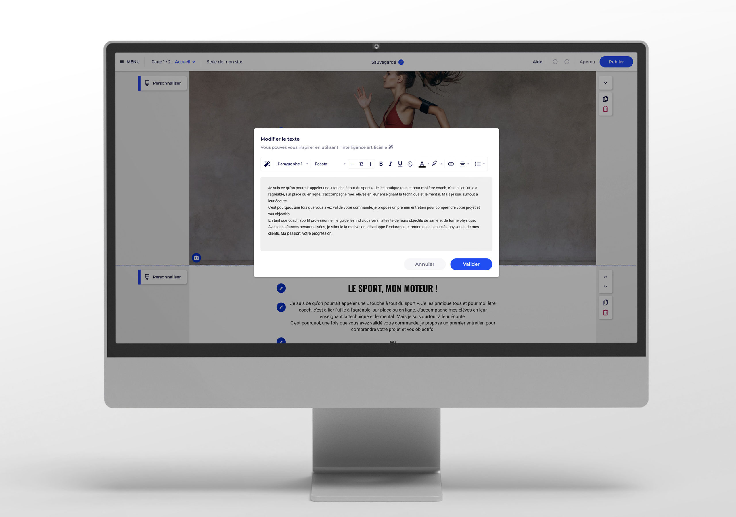 Mon rôle au sein de ce projet novateur a été de faciliter la création rapide de contenu pour l’utilisateur grâce à l’intelligence artificielle. Dans le cadre de cette mission, j’ai introduit une fonctionnalité particulièrement intuitive dans l’éditeur de site web. En sélectionnant la partie texte, un icône en forme de baguette magique apparaît. En cliquant sur cette icône, l’utilisateur se voit offrir la possibilité de générer son texte instantanément grâce à l’intelligence artificielle.